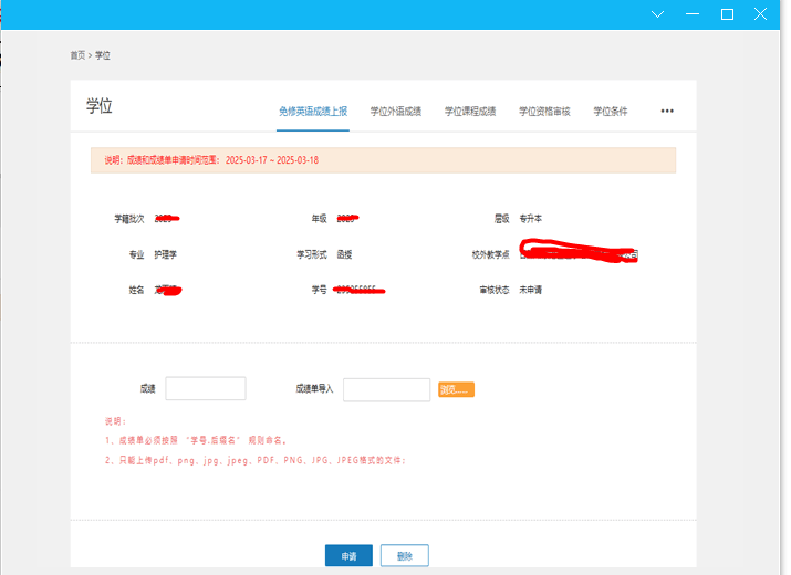 (1)提交时请仔细阅读免修学位英语成绩上报模块中说明。