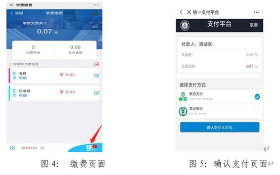 3.点击“学宿费待缴”(图3)后,选择需要缴费的项目,再点击右下角“缴费”图标(图4)。核对“付款人”、“交易金额”等支付信息,选择“聚合支付”后,再点击确认支付(图5)。