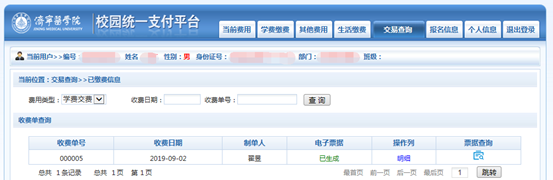 点击导航栏的“交易查询”-“已缴费信息”,进入如下界面: