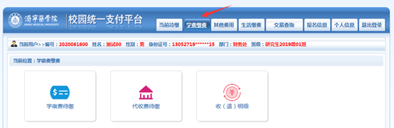 登录后,点击“学费缴费”中的“学宿费待缴”,系统会显示当前登陆用户的欠费项目及明细,选择需要缴费的项目后点击下方“下一步”图标,按步骤缴费即可。