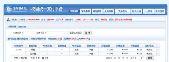 登录后,在“当前待缴”界面将显示当前登陆用户的欠费项目及明细